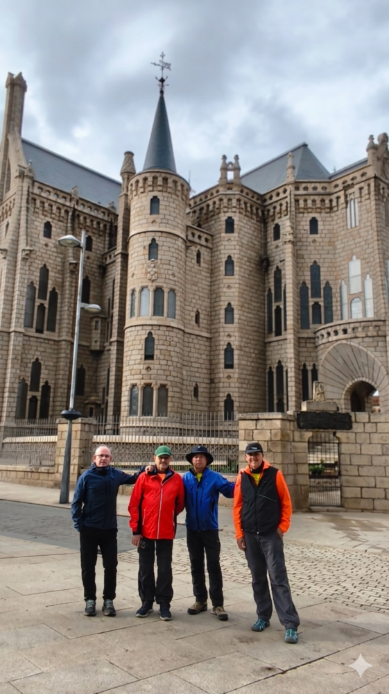 Tras reposar en el albergue, a las seis y media hemos dado una vuelta por Astorga: la Catedral, el Ayuntamiento y el Palacio de Gaudí. Este palacio neogótico, una de las pocas obras de Gaudí fuera de Cataluña, fue encargado tras el incendio del antiguo palacio episcopal en 1886. Su mezcla de castillo medieval y templo refleja el estilo personal del arquitecto.