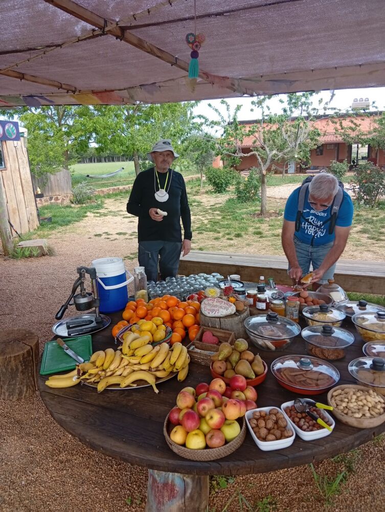 Hoy solo hemos parado en un sitio emblemático: el Jardín del Alma. Un lugar sencillo, humano y basado en la confianza, donde el peregrino encuentra descanso, agua fresca, frutas, café y galletas a cambio de la voluntad. Un pequeño oasis del Camino.