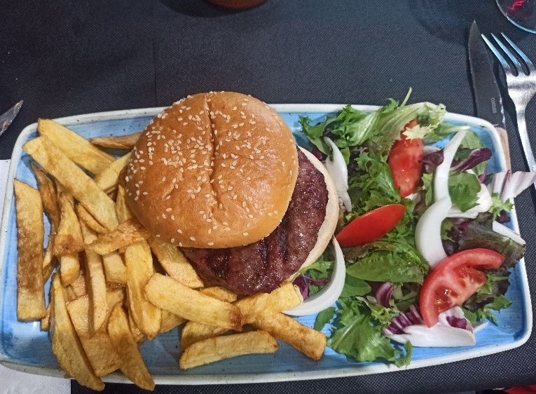 Hemos comido, por primera vez, sin José Antonio, que está hospedado en otro sitio algo alejado, en el Mesón El Tres. Muy bien: zamburiñas y hamburguesas.
